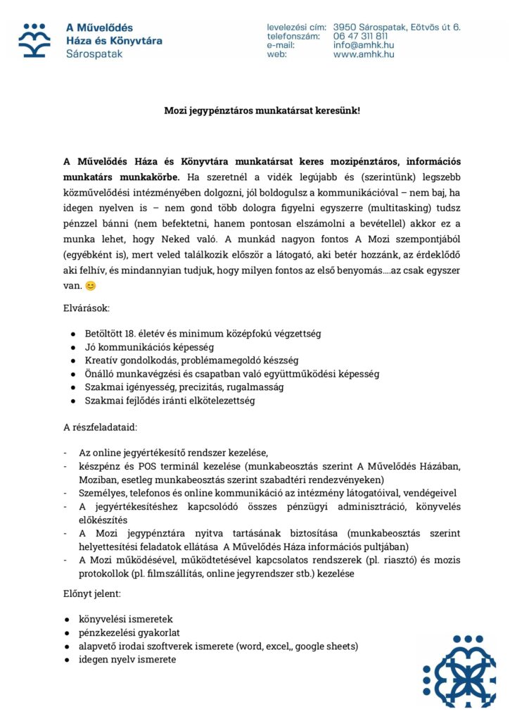 A Művelődés Háza és Könyvtára munkatársat keres mozipénztáros, információs munkatárs munkakörbe. Ha szeretnél a vidék legújabb és (szerintünk) legszebb közművelődési intézményében dolgozni, jól boldogulsz a kommunikációval – nem baj, ha idegen nyelven is – nem gond több dologra figyelni egyszerre (multitasking) tudsz pénzzel bánni (nem befektetni, hanem pontosan elszámolni a bevétellel) akkor ez a munka lehet, hogy Neked való. A munkád nagyon fontos A Mozi szempontjából (egyébként is), mert veled találkozik először a látogató, aki betér hozzánk, az érdeklődő aki felhív, és mindannyian tudjuk, hogy milyen fontos az első benyomás….az csak egyszer van.😊