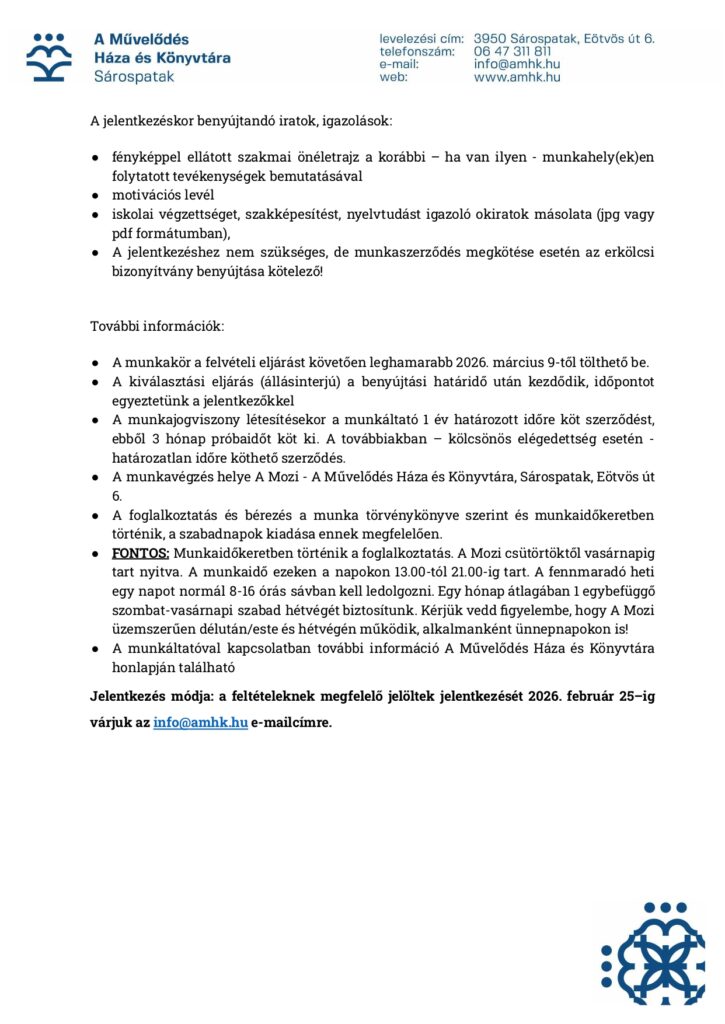 • A munkavégzés helye A Mozi – A Művelődés Háza és Könyvtára, Sárospatak, Eötvös út 6.