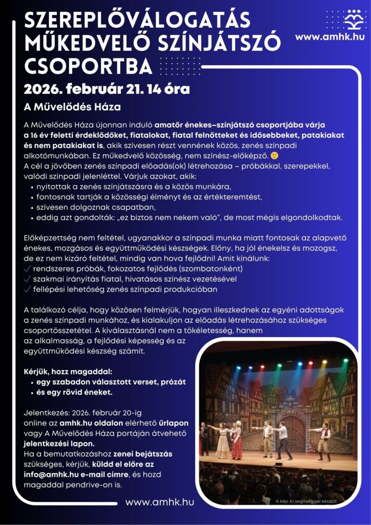A Művelődés Háza újonnan induló amatőr énekes–színjátszó csoportjába várja