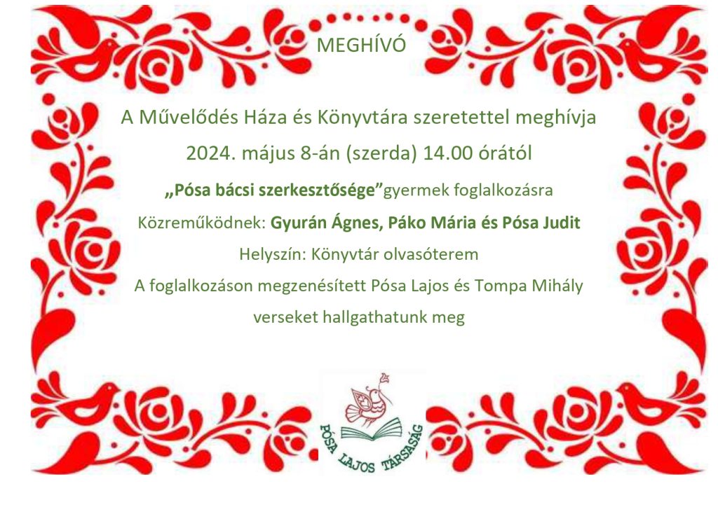2024. május 8-án a Pósa Lajos Társaság látogatott el a Zrínyi Ilona Városi Könyvtárba, ahol nagy népszerűségnek örvendő gyermek foglalkozást tartottak.