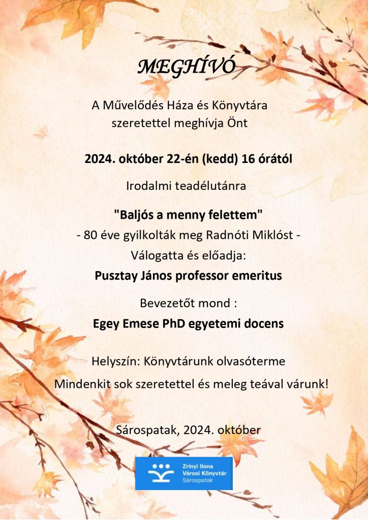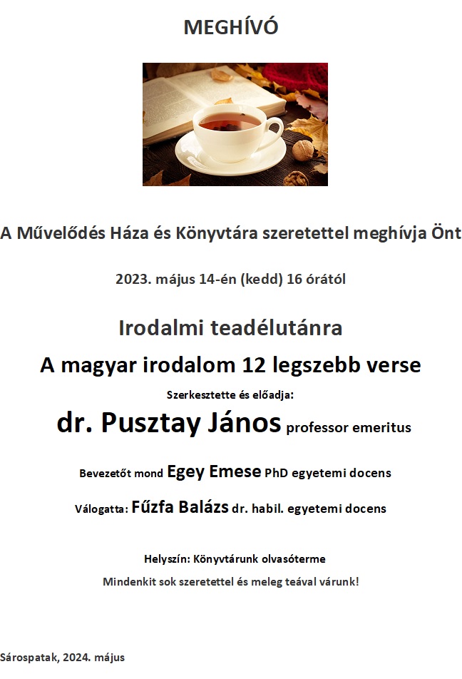 Május 14-én a Zrínyi Ilona Városi Könyvtárban irodalmi teadélutánt tartottunk. Vendégünk dr. Pusztay János professor emeritus volt, aki “a magyar irodalom 12 legszebb versét” tolmácsolta a nézőközönség számára.