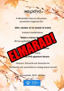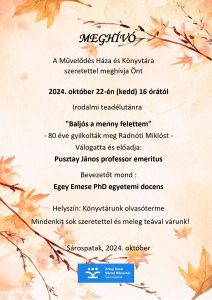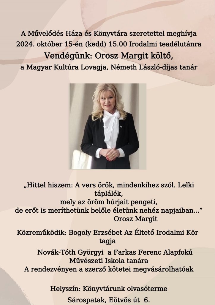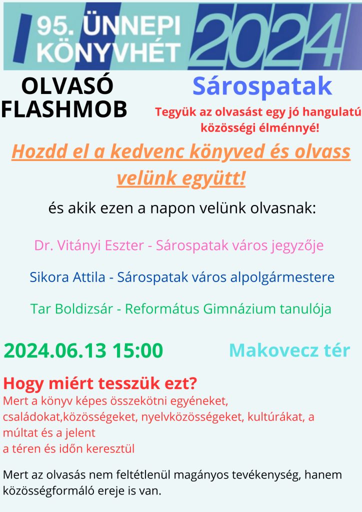 Sárospatakon a Makovecz téren várjuk sok szeretettel kedves olvasóinkat 2024.június 13-án, az ünnepi könyvhét keretein belül rendezett Olvasó flashmobra.