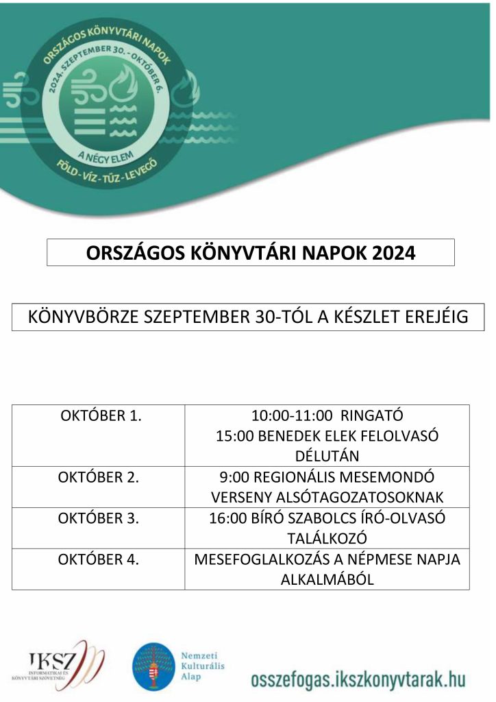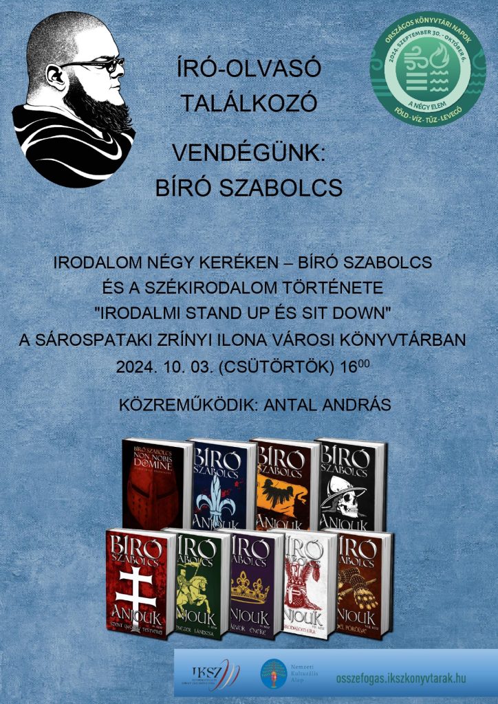 2024.10.03-án Bíró Szabolcs látogat el könyvtárunkba egy nagyszerű beszélgetésre. Műveinek fő témája a középkori történelem, ám írt már fantasyt, horrort, ifjúsági regényt, képregényt, forgatókönyvet és mesekönyvet is. 2016-ban, a Szent György Lovagrend alapításának 690. évfordulóján, Visegrádon lovaggá ütötték. 2017-ben Eger Kulturális Nagykövete lett. 2018-ban megkapta a Szent György Lovagrend lovagkeresztjét, hadiszalagon a Szent Koronával.